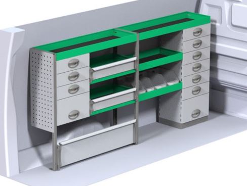 Kuormatilan mittainen hyllyratkaisu kuudella vetolaatikolla vasemmalle puolelle tavaratilaa. Valmistaja Modul System.